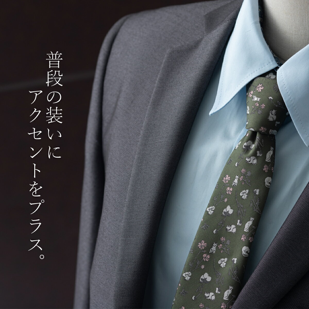 猫好きの方に キャット デザイン ネクタイ フラワープリント 刺繍 洗えるイージーケア ダークグリーン CHILLWORK ウォッシャブル 洗濯OK クイトランニング チルワーク メンズ 英国ブランド 個性的 男性向け ビジネス 趣味 就活 ギフト 祝い 卒業式 父の日 トラッド